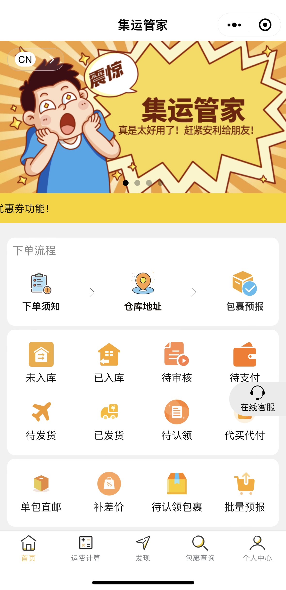 嗨轉(zhuǎn)寶集運小程序清晰明了的訂單管理系統(tǒng):待打包、待支付、待發(fā)貨、貨到付款、已發(fā)貨一目了然
